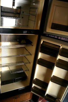On to the refrigerator. Plugged in? Check. Gas valve on? Check. Flip the switch to auto and the power switch to high humidity, nothing. The engine battery has been charged, but the marine batteries in it are no good and I want some six volt amp hours. Off to Costco. and four new golf cart batteries later for "me" and a slice of cheese pizza for Michelle and we're back home.
